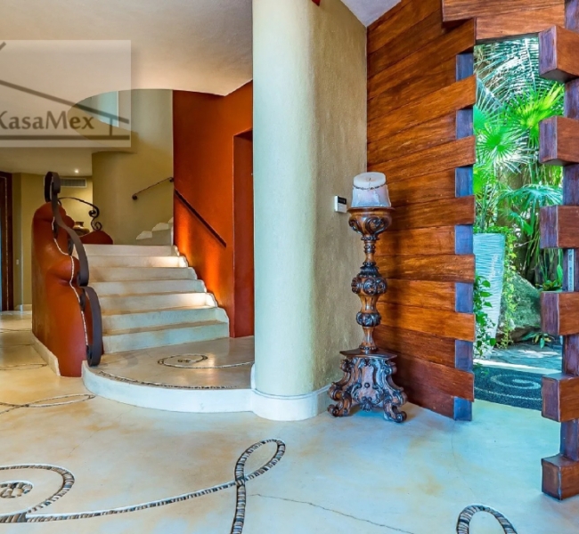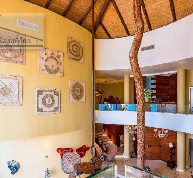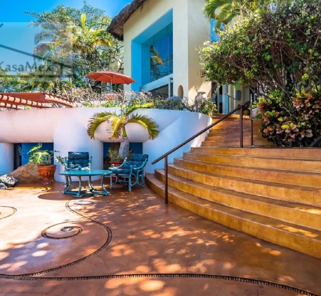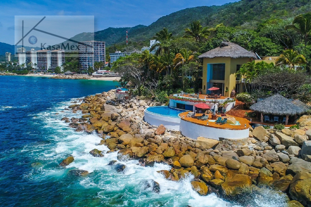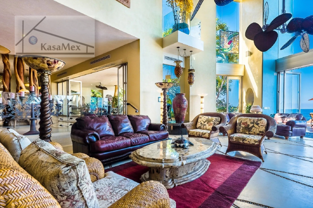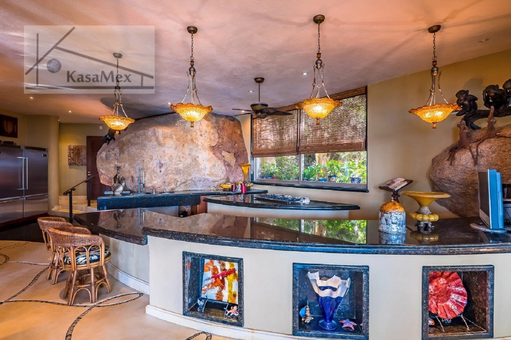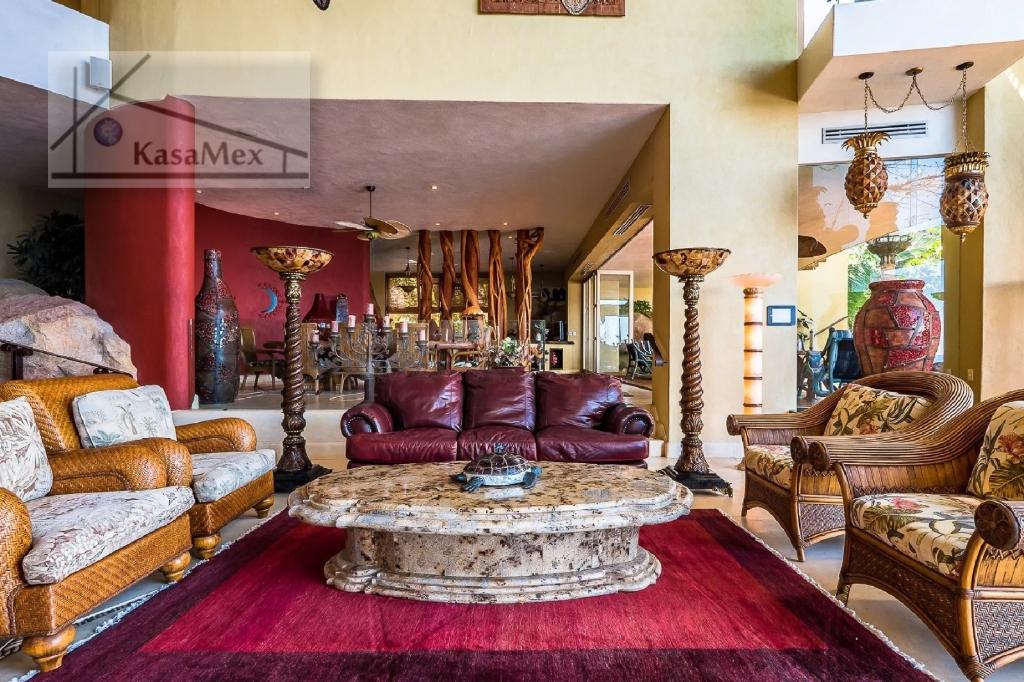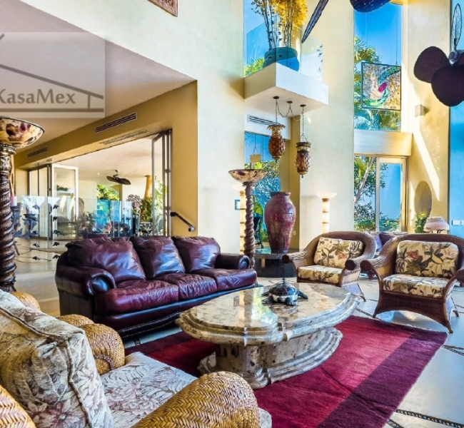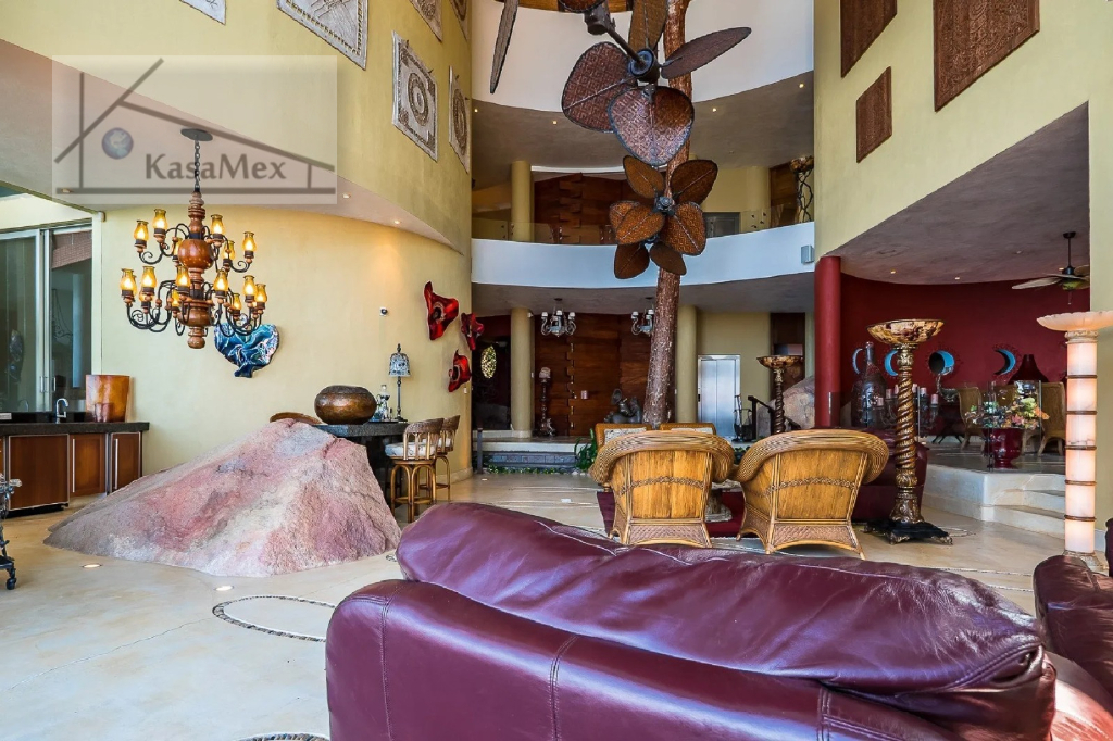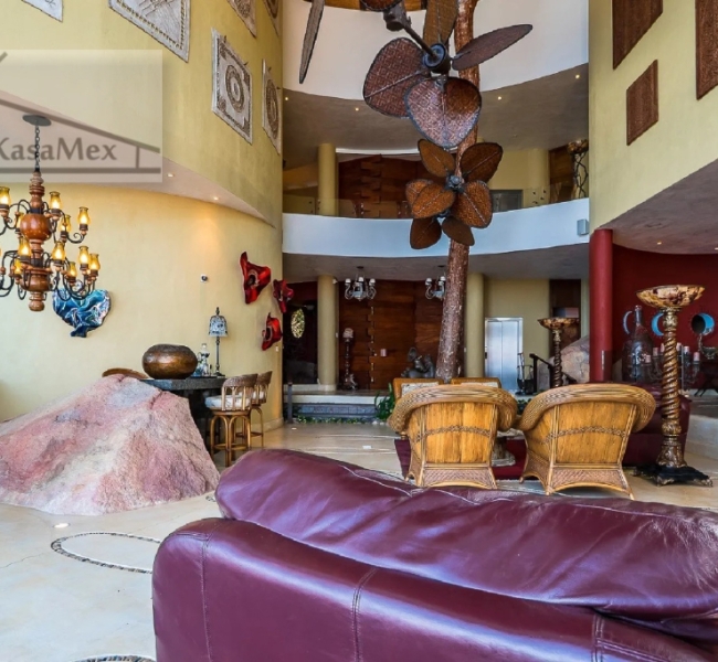 Situated on perhaps the most important site in the exclusive gated community in Puerto Vallarta. You are greeted by an imposing 2-story high solid wood entry door system. Upon entering the home your eyes are drawn to the expansive views of the Bay of Banderas and the entire coastline all the way to Punta Mita. The impressive and dramatic main living area is nearly 3 stories tall with a living tree meandering all the way through the roofline and the appearance of a palapa ceiling and roof. Custom-designed for entertaining, the living area opens to a full bar complete with its own natural rock formation embedded within and on the opposite side leads to the raised dining area. A culinary masterpiece, the design of the kitchen affords entertaining and preparation in an abundant space with the centerpiece being the boulder outcropping, bringing nature inside the living environment. While the overall breadth of the home is substantial, it is extremely liveable on only two floors and is fully serviced by an elevator. Living area 11,506 Sq Ft. Lot Site .3296 Acres As you walk through this turnkey home, note the artistic architectural details, from rounded walls, embedded hand-cut and placed river stones, exquisite marble, granite and stone surfaces, stained concrete flooring, and designs focused on taking advantage of the remarkable ocean vistas. Many of the bedrooms have dual purposes as is evidenced by their current use. For example the home is replete with a private home theater and executive office, both of which are easily converted to fully functioning bedrooms with their own private en-suite baths and walk-in closets with built-in cabinetry. The guest quarters is effectively a separate apartment and can be used by visiting guests who wish for additional privacy, or used as comfortable staff quarters with its own living room, kitchen area, private bedroom and full bath. In addition, the villa has a gym with private terrace, wine cellar for 100 bottles and a game/card room with private terrace overlooking the gardens. What would an oceanfront estate be without rambling terraces and patios to enjoy the lapping waves below? Thousands of feet of patio and terrace areas, off the bedrooms as well as off the main living areas of the home provide for an abundance of areas for relaxation and entertaining. The main terrace of the living room features a water trough feature with fountains, while the covered patio off the kitchen is ideal for dining at any time of the day. A heated Jacuzzi and pool offer the sun worshipers their own areas of captivation. Of course, the pool area also has a full bar and bathroom. And all of this engulfed by Mother Nature’s tropical paradise that surrounds Puerto Vallarta. There are simply too many features and amenities of this dramatic and artistic home to list out in such a small property profile. We invited you to set an appointment & discover for yourself this gorgeous property. The Price $ 3,950,000 USD. Price may vary without previous notice due to the exchange rate