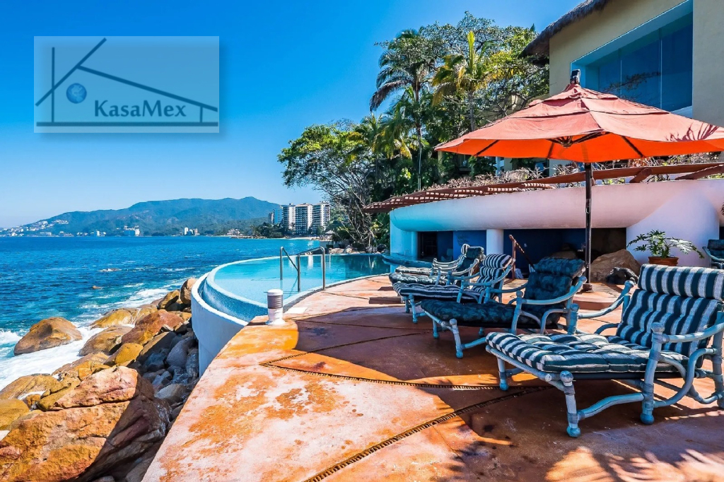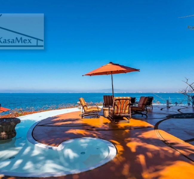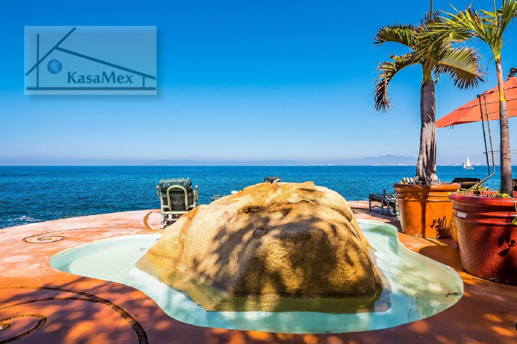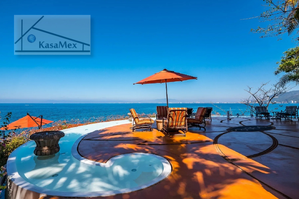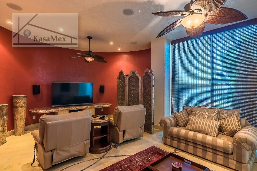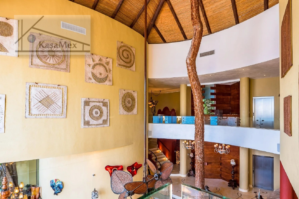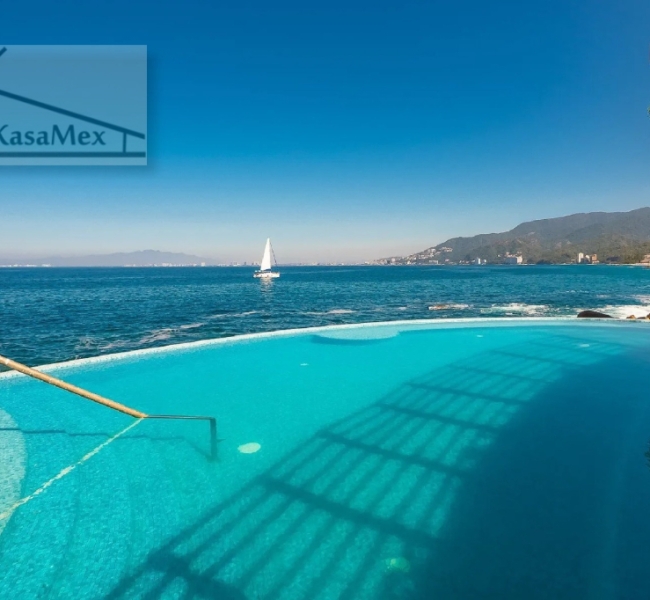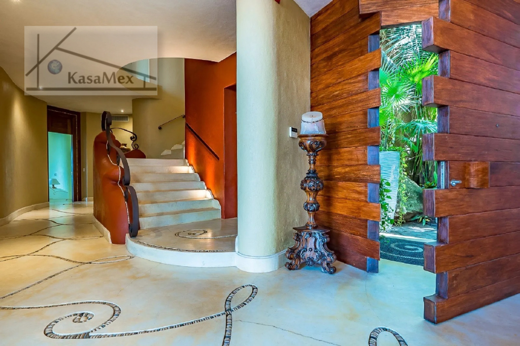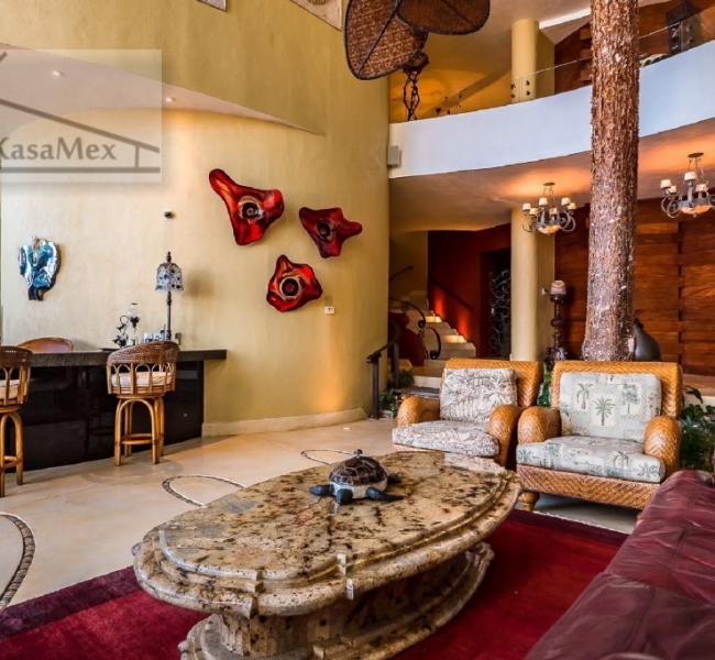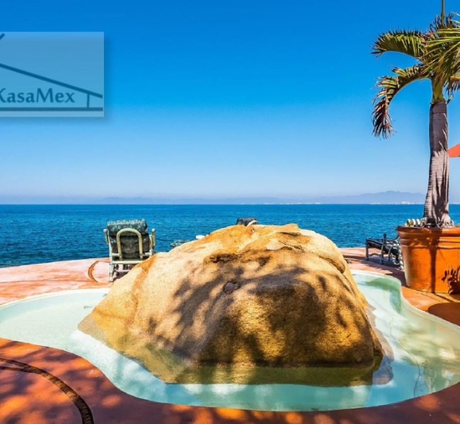 Situated on perhaps the most important site in the exclusive gated community in Puerto Vallarta. You are greeted by an imposing 2-story high solid wood entry door system. Upon entering the home your eyes are drawn to the expansive views of the Bay of Banderas and the entire coastline all the way to Punta Mita. The impressive and dramatic main living area is nearly 3 stories tall with a living tree meandering all the way through the roofline and the appearance of a palapa ceiling and roof. Custom-designed for entertaining, the living area opens to a full bar complete with its own natural rock formation embedded within and on the opposite side leads to the raised dining area. A culinary masterpiece, the design of the kitchen affords entertaining and preparation in an abundant space with the centerpiece being the boulder outcropping, bringing nature inside the living environment. While the overall breadth of the home is substantial, it is extremely liveable on only two floors and is fully serviced by an elevator. Living area 11,506 Sq Ft. Lot Site .3296 Acres As you walk through this turnkey home, note the artistic architectural details, from rounded walls, embedded hand-cut and placed river stones, exquisite marble, granite and stone surfaces, stained concrete flooring, and designs focused on taking advantage of the remarkable ocean vistas. Many of the bedrooms have dual purposes as is evidenced by their current use. For example the home is replete with a private home theater and executive office, both of which are easily converted to fully functioning bedrooms with their own private en-suite baths and walk-in closets with built-in cabinetry. The guest quarters is effectively a separate apartment and can be used by visiting guests who wish for additional privacy, or used as comfortable staff quarters with its own living room, kitchen area, private bedroom and full bath. In addition, the villa has a gym with private terrace, wine cellar for 100 bottles and a game/card room with private terrace overlooking the gardens. What would an oceanfront estate be without rambling terraces and patios to enjoy the lapping waves below? Thousands of feet of patio and terrace areas, off the bedrooms as well as off the main living areas of the home provide for an abundance of areas for relaxation and entertaining. The main terrace of the living room features a water trough feature with fountains, while the covered patio off the kitchen is ideal for dining at any time of the day. A heated Jacuzzi and pool offer the sun worshipers their own areas of captivation. Of course, the pool area also has a full bar and bathroom. And all of this engulfed by Mother Nature’s tropical paradise that surrounds Puerto Vallarta. There are simply too many features and amenities of this dramatic and artistic home to list out in such a small property profile. We invited you to set an appointment & discover for yourself this gorgeous property. The Price $ 3,950,000 USD. Price may vary without previous notice due to the exchange rate