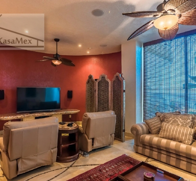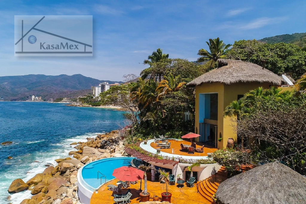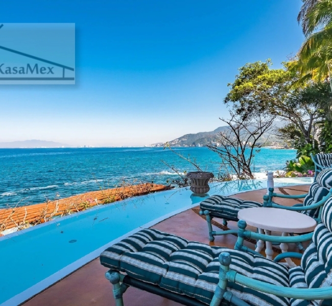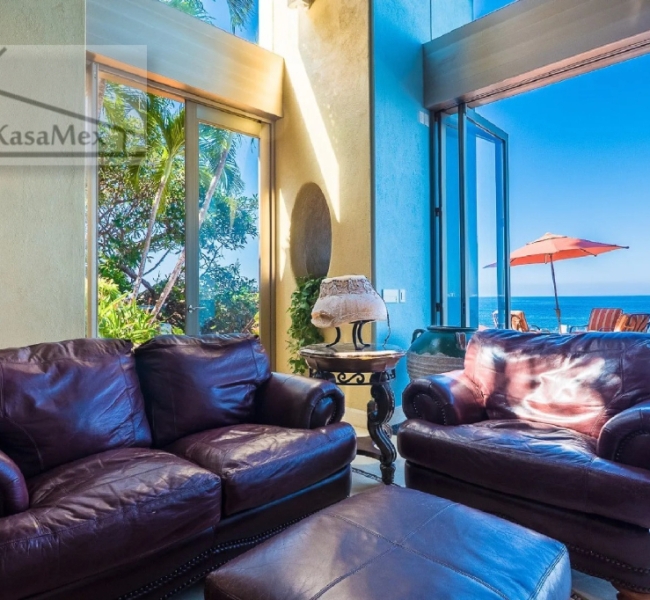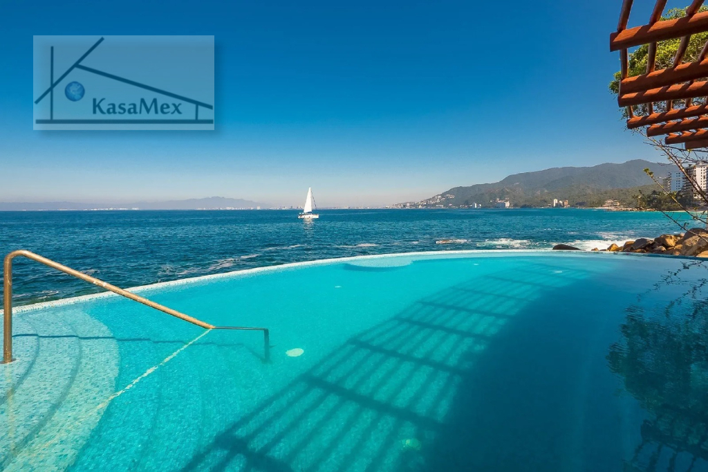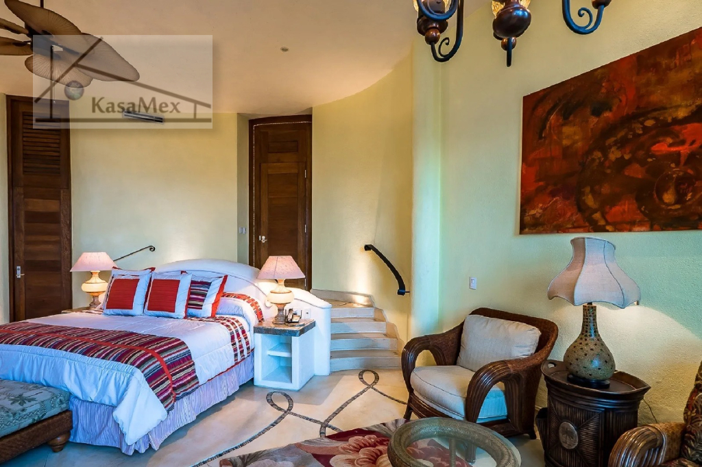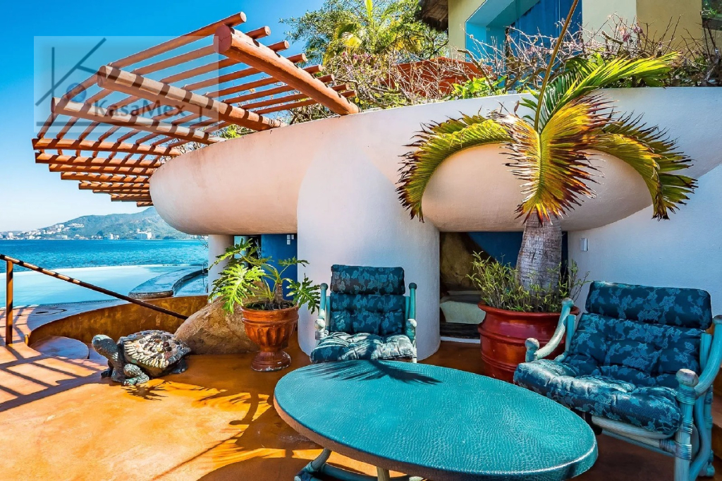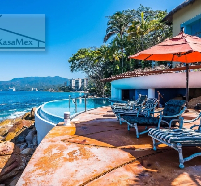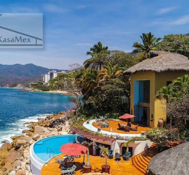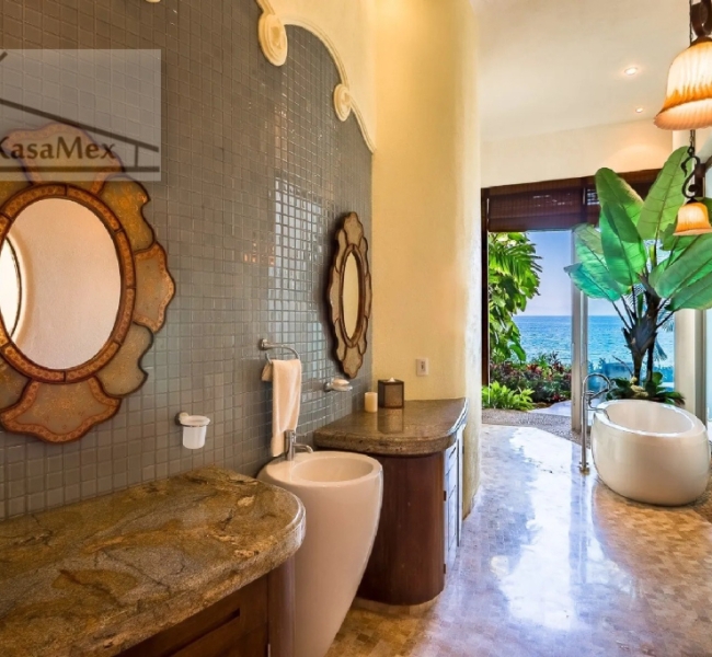Situated on perhaps the most important site in the exclusive gated community in Puerto Vallarta. You are greeted by an imposing 2-story high solid wood entry door system. Upon entering the home your eyes are drawn to the expansive views of the Bay of Banderas and the entire coastline all the way to Punta Mita. The impressive and dramatic main living area is nearly 3 stories tall with a living tree meandering all the way through the roofline and the appearance of a palapa ceiling and roof. Custom-designed for entertaining, the living area opens to a full bar complete with its own natural rock formation embedded within and on the opposite side leads to the raised dining area. A culinary masterpiece, the design of the kitchen affords entertaining and preparation in an abundant space with the centerpiece being the boulder outcropping, bringing nature inside the living environment. While the overall breadth of the home is substantial, it is extremely liveable on only two floors and is fully serviced by an elevator. Living area 11,506 Sq Ft. Lot Site .3296 Acres As you walk through this turnkey home, note the artistic architectural details, from rounded walls, embedded hand-cut and placed river stones, exquisite marble, granite and stone surfaces, stained concrete flooring, and designs focused on taking advantage of the remarkable ocean vistas. Many of the bedrooms have dual purposes as is evidenced by their current use. For example the home is replete with a private home theater and executive office, both of which are easily converted to fully functioning bedrooms with their own private en-suite baths and walk-in closets with built-in cabinetry. The guest quarters is effectively a separate apartment and can be used by visiting guests who wish for additional privacy, or used as comfortable staff quarters with its own living room, kitchen area, private bedroom and full bath. In addition, the villa has a gym with private terrace, wine cellar for 100 bottles and a game/card room with private terrace overlooking the gardens. What would an oceanfront estate be without rambling terraces and patios to enjoy the lapping waves below? Thousands of feet of patio and terrace areas, off the bedrooms as well as off the main living areas of the home provide for an abundance of areas for relaxation and entertaining. The main terrace of the living room features a water trough feature with fountains, while the covered patio off the kitchen is ideal for dining at any time of the day. A heated Jacuzzi and pool offer the sun worshipers their own areas of captivation. Of course, the pool area also has a full bar and bathroom. And all of this engulfed by Mother Nature’s tropical paradise that surrounds Puerto Vallarta. There are simply too many features and amenities of this dramatic and artistic home to list out in such a small property profile. We invited you to set an appointment & discover for yourself this gorgeous property. The Price $ 3,950,000 USD. Price may vary without previous notice due to the exchange rate