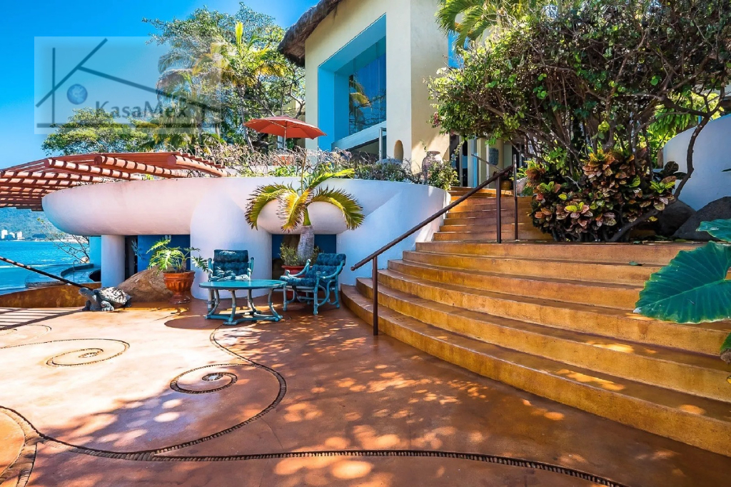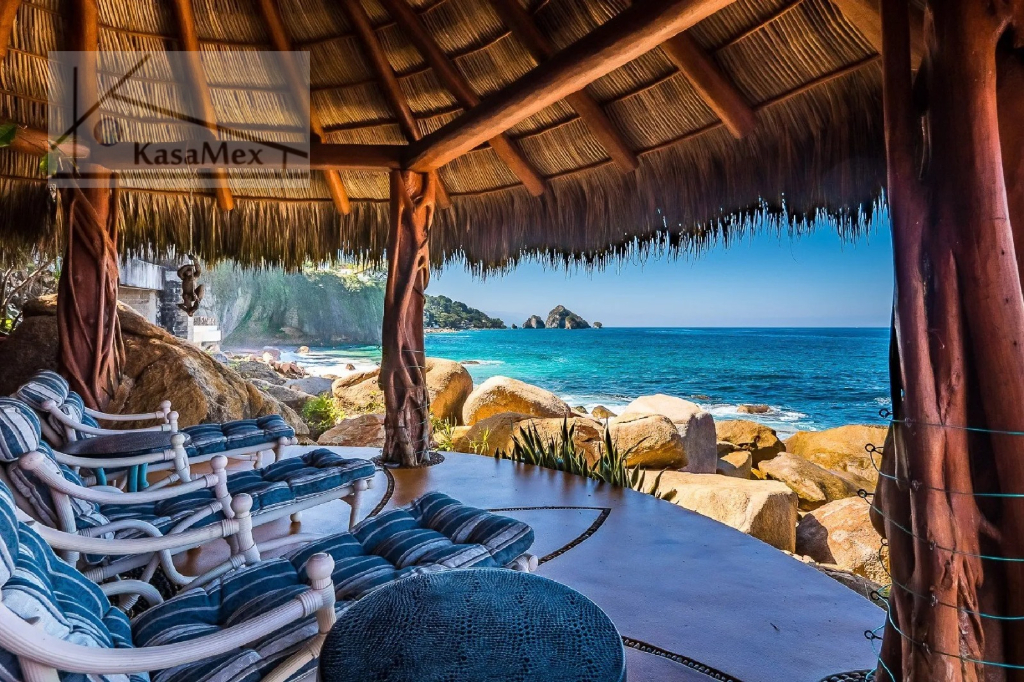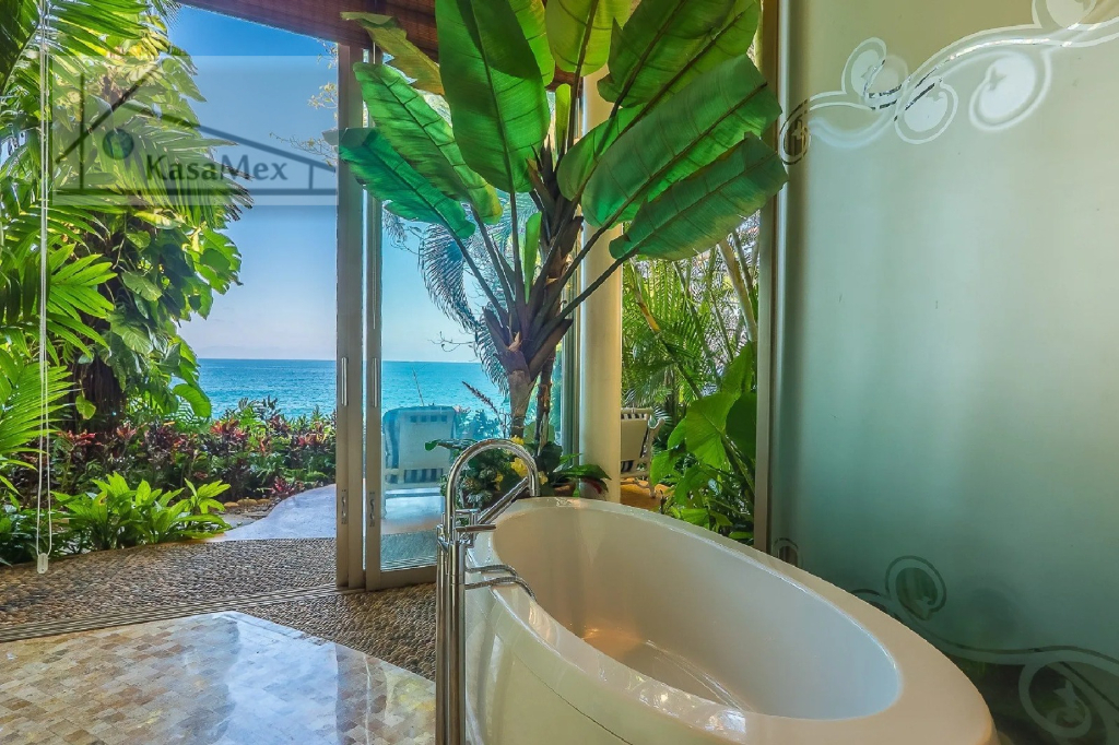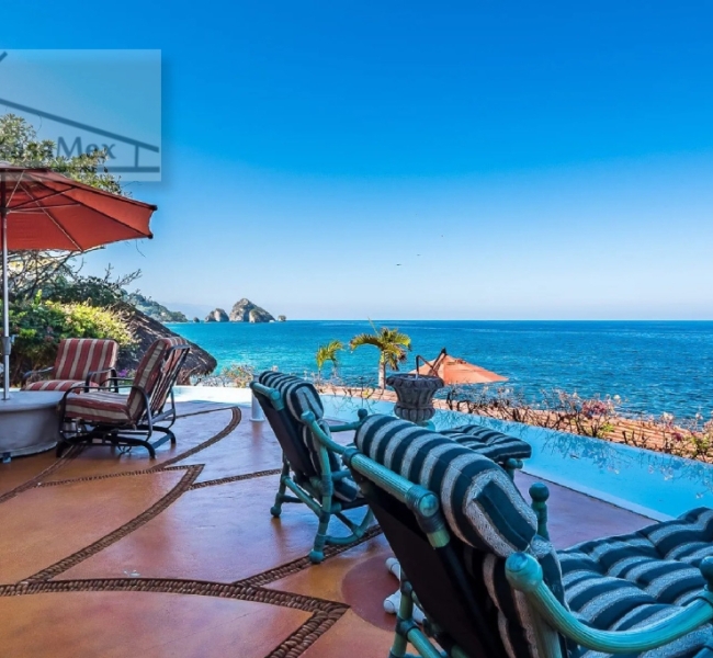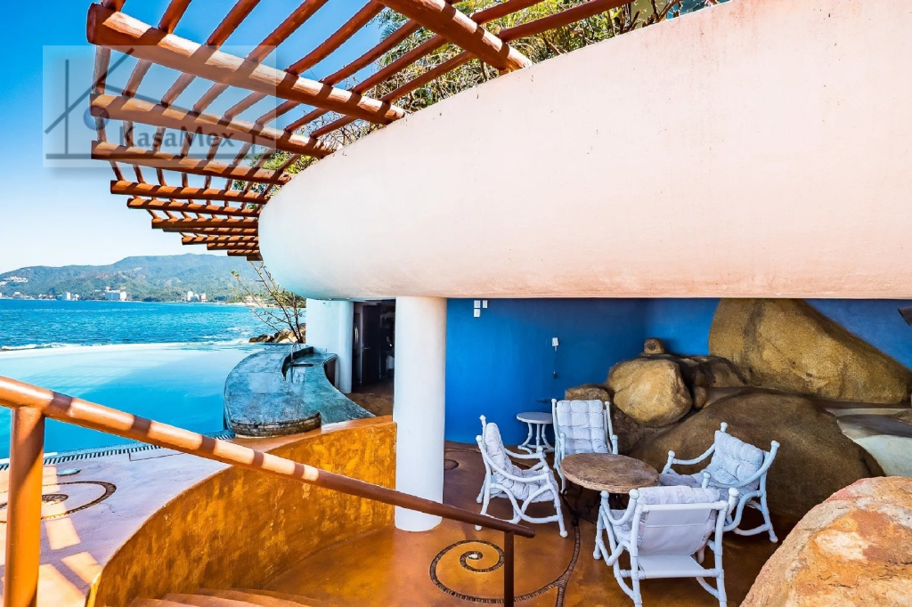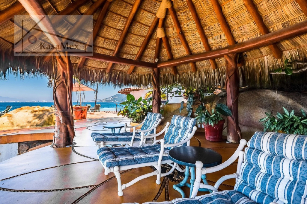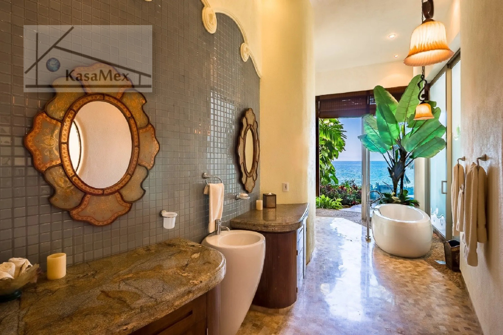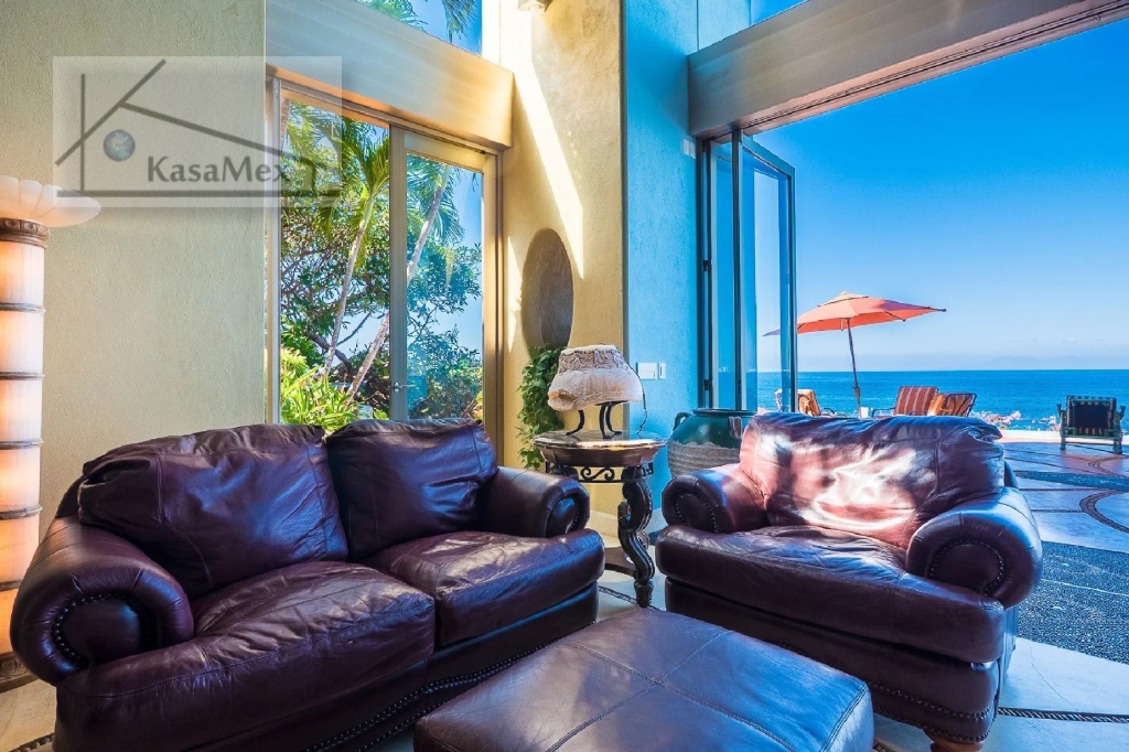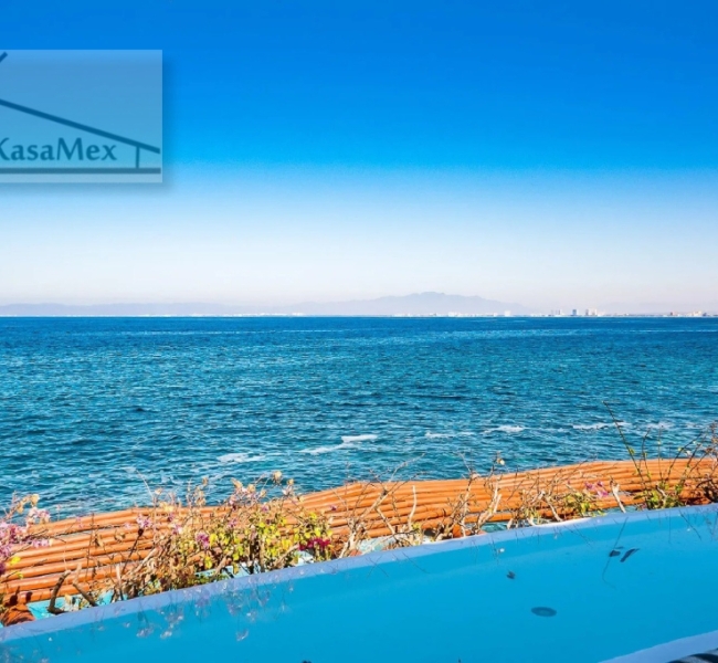 Situated on perhaps the most important site in the exclusive gated community in Puerto Vallarta. You are greeted by an imposing 2-story high solid wood entry door system. Upon entering the home your eyes are drawn to the expansive views of the Bay of Banderas and the entire coastline all the way to Punta Mita. The impressive and dramatic main living area is nearly 3 stories tall with a living tree meandering all the way through the roofline and the appearance of a palapa ceiling and roof. Custom-designed for entertaining, the living area opens to a full bar complete with its own natural rock formation embedded within and on the opposite side leads to the raised dining area. A culinary masterpiece, the design of the kitchen affords entertaining and preparation in an abundant space with the centerpiece being the boulder outcropping, bringing nature inside the living environment. While the overall breadth of the home is substantial, it is extremely liveable on only two floors and is fully serviced by an elevator. Living area 11,506 Sq Ft. Lot Site .3296 Acres As you walk through this turnkey home, note the artistic architectural details, from rounded walls, embedded hand-cut and placed river stones, exquisite marble, granite and stone surfaces, stained concrete flooring, and designs focused on taking advantage of the remarkable ocean vistas. Many of the bedrooms have dual purposes as is evidenced by their current use. For example the home is replete with a private home theater and executive office, both of which are easily converted to fully functioning bedrooms with their own private en-suite baths and walk-in closets with built-in cabinetry. The guest quarters is effectively a separate apartment and can be used by visiting guests who wish for additional privacy, or used as comfortable staff quarters with its own living room, kitchen area, private bedroom and full bath. In addition, the villa has a gym with private terrace, wine cellar for 100 bottles and a game/card room with private terrace overlooking the gardens. What would an oceanfront estate be without rambling terraces and patios to enjoy the lapping waves below? Thousands of feet of patio and terrace areas, off the bedrooms as well as off the main living areas of the home provide for an abundance of areas for relaxation and entertaining. The main terrace of the living room features a water trough feature with fountains, while the covered patio off the kitchen is ideal for dining at any time of the day. A heated Jacuzzi and pool offer the sun worshipers their own areas of captivation. Of course, the pool area also has a full bar and bathroom. And all of this engulfed by Mother Nature’s tropical paradise that surrounds Puerto Vallarta. There are simply too many features and amenities of this dramatic and artistic home to list out in such a small property profile. We invited you to set an appointment & discover for yourself this gorgeous property. The Price $ 3,950,000 USD. Price may vary without previous notice due to the exchange rate