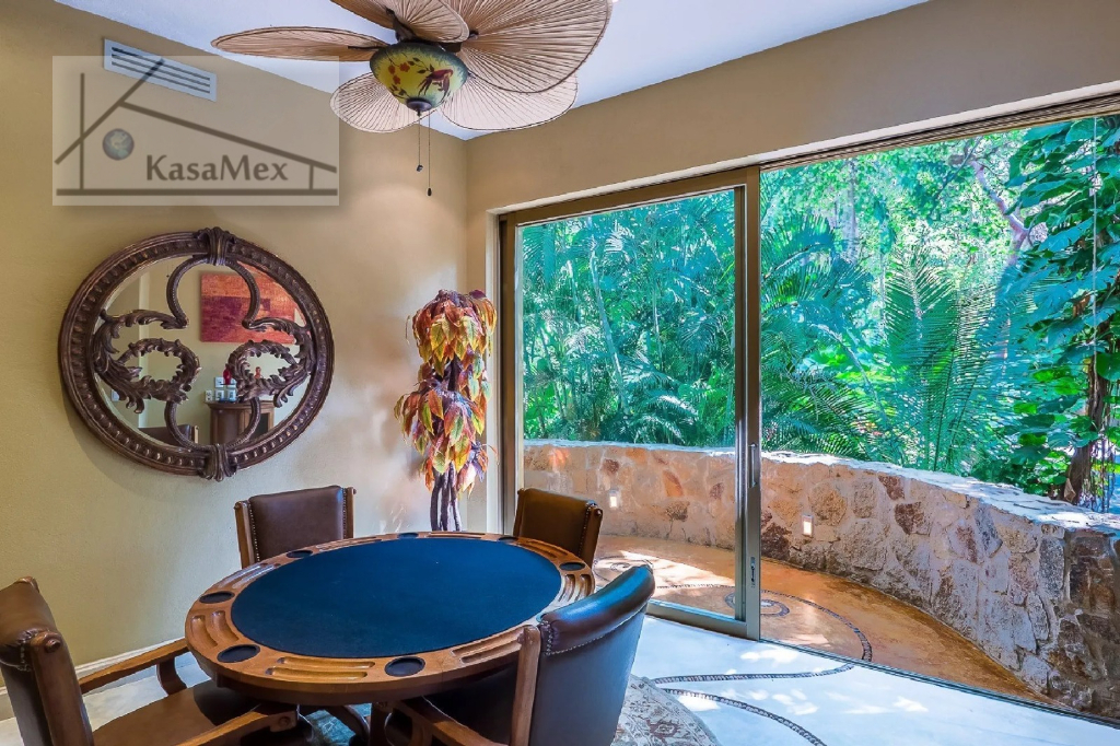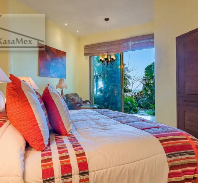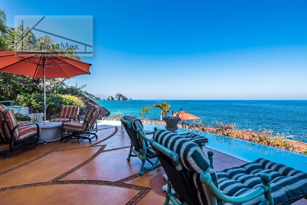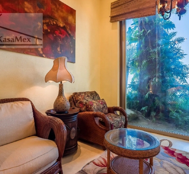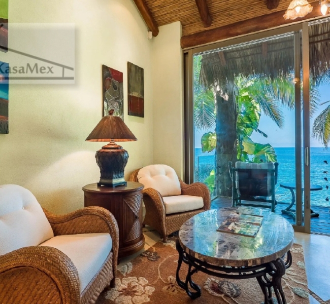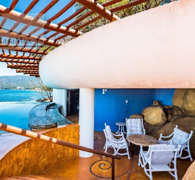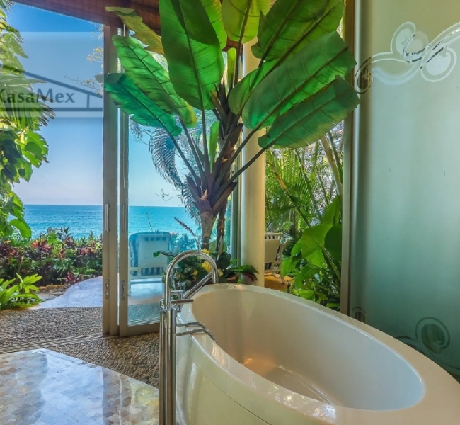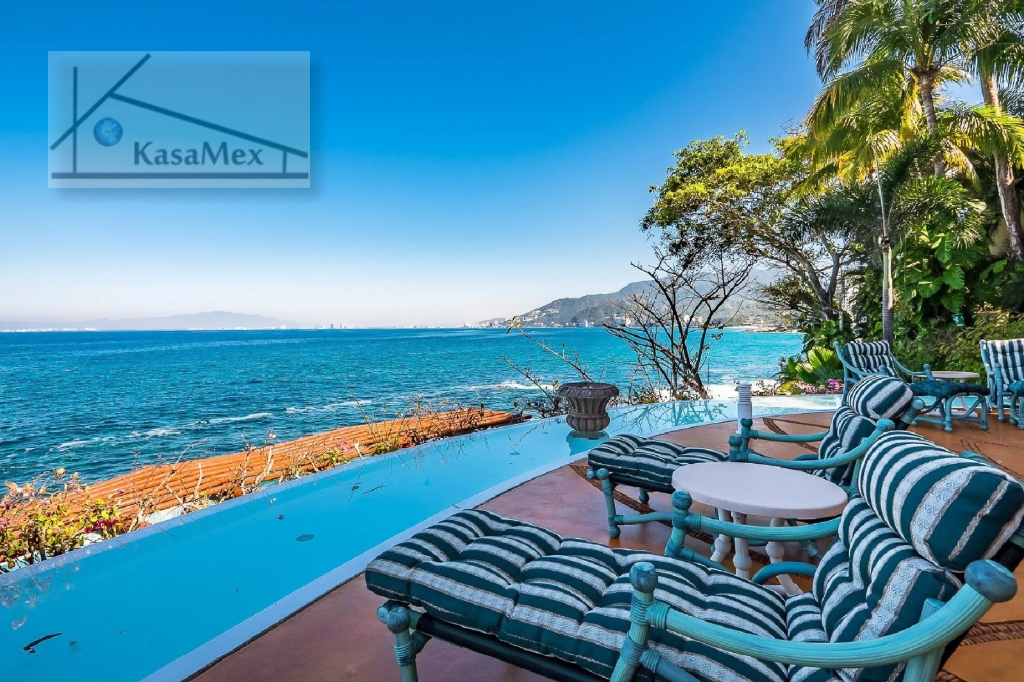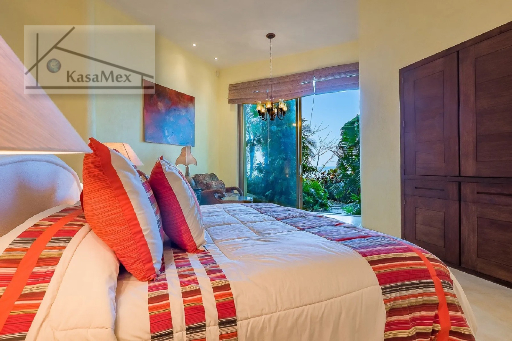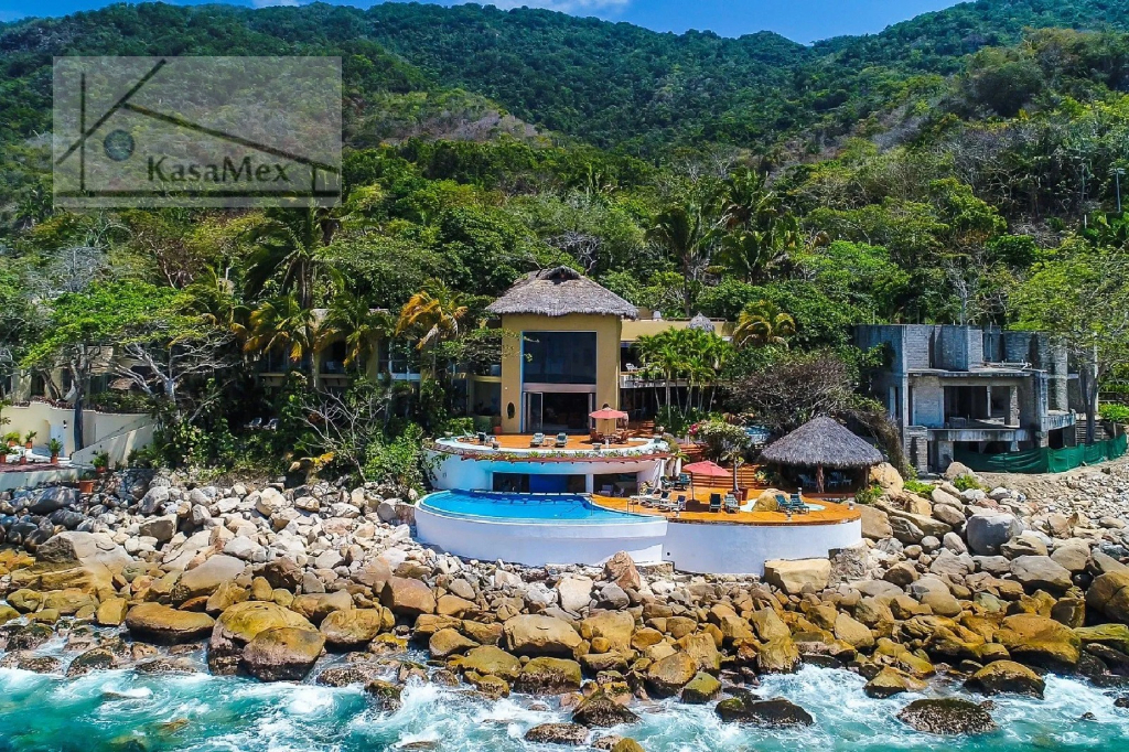 Situated on perhaps the most important site in the exclusive gated community in Puerto Vallarta. You are greeted by an imposing 2-story high solid wood entry door system. Upon entering the home your eyes are drawn to the expansive views of the Bay of Banderas and the entire coastline all the way to Punta Mita. The impressive and dramatic main living area is nearly 3 stories tall with a living tree meandering all the way through the roofline and the appearance of a palapa ceiling and roof. Custom-designed for entertaining, the living area opens to a full bar complete with its own natural rock formation embedded within and on the opposite side leads to the raised dining area. A culinary masterpiece, the design of the kitchen affords entertaining and preparation in an abundant space with the centerpiece being the boulder outcropping, bringing nature inside the living environment. While the overall breadth of the home is substantial, it is extremely liveable on only two floors and is fully serviced by an elevator. Living area 11,506 Sq Ft. Lot Site .3296 Acres As you walk through this turnkey home, note the artistic architectural details, from rounded walls, embedded hand-cut and placed river stones, exquisite marble, granite and stone surfaces, stained concrete flooring, and designs focused on taking advantage of the remarkable ocean vistas. Many of the bedrooms have dual purposes as is evidenced by their current use. For example the home is replete with a private home theater and executive office, both of which are easily converted to fully functioning bedrooms with their own private en-suite baths and walk-in closets with built-in cabinetry. The guest quarters is effectively a separate apartment and can be used by visiting guests who wish for additional privacy, or used as comfortable staff quarters with its own living room, kitchen area, private bedroom and full bath. In addition, the villa has a gym with private terrace, wine cellar for 100 bottles and a game/card room with private terrace overlooking the gardens. What would an oceanfront estate be without rambling terraces and patios to enjoy the lapping waves below? Thousands of feet of patio and terrace areas, off the bedrooms as well as off the main living areas of the home provide for an abundance of areas for relaxation and entertaining. The main terrace of the living room features a water trough feature with fountains, while the covered patio off the kitchen is ideal for dining at any time of the day. A heated Jacuzzi and pool offer the sun worshipers their own areas of captivation. Of course, the pool area also has a full bar and bathroom. And all of this engulfed by Mother Nature’s tropical paradise that surrounds Puerto Vallarta. There are simply too many features and amenities of this dramatic and artistic home to list out in such a small property profile. We invited you to set an appointment & discover for yourself this gorgeous property. The Price $ 3,950,000 USD. Price may vary without previous notice due to the exchange rate