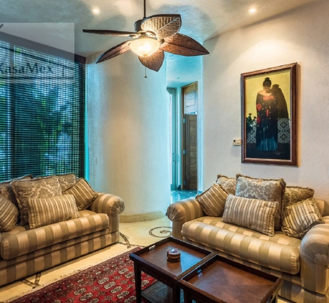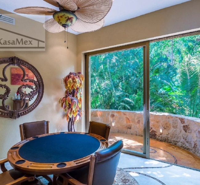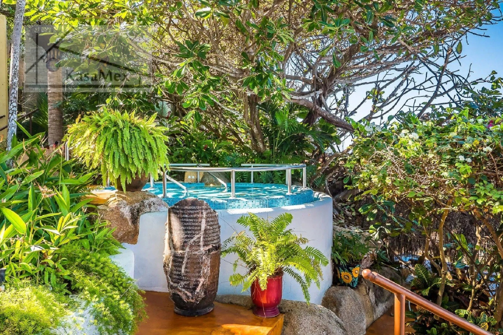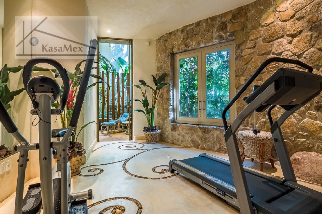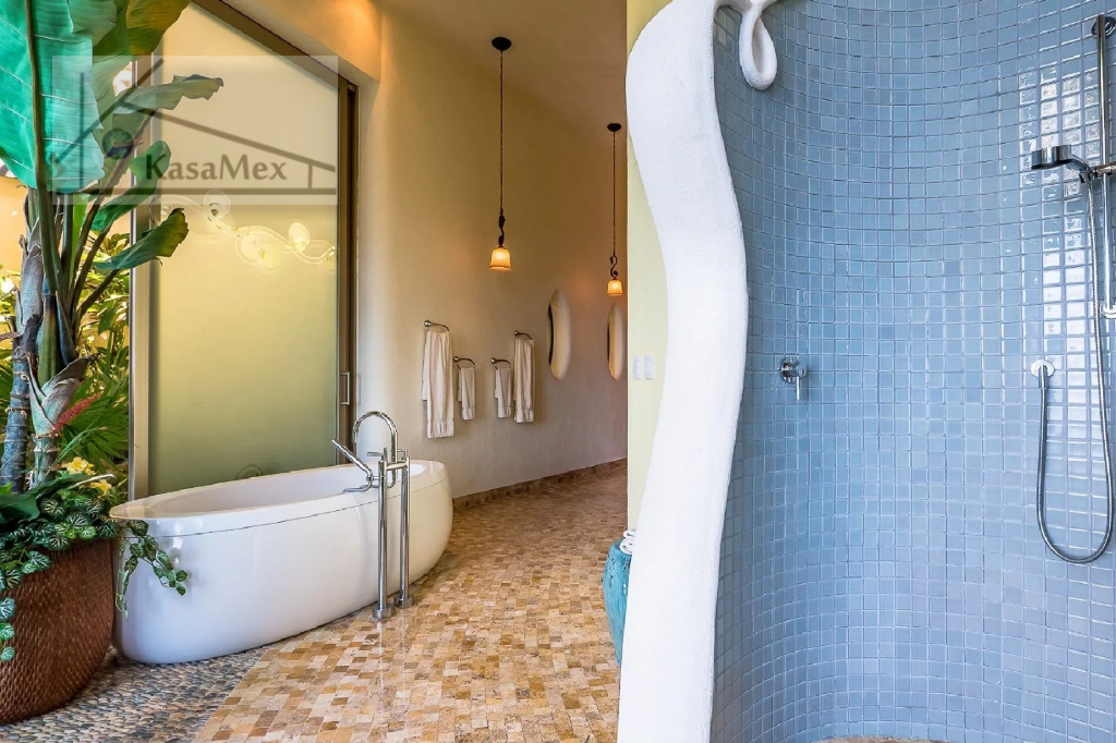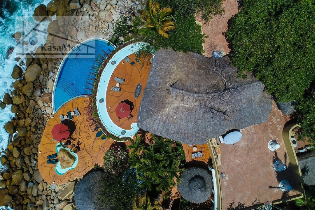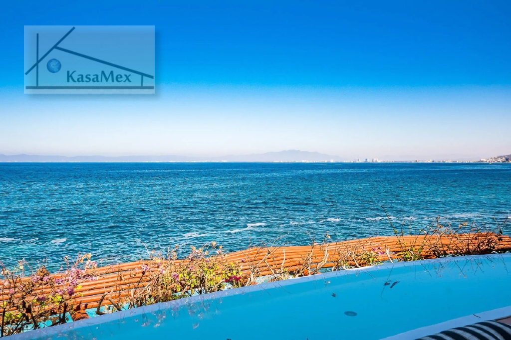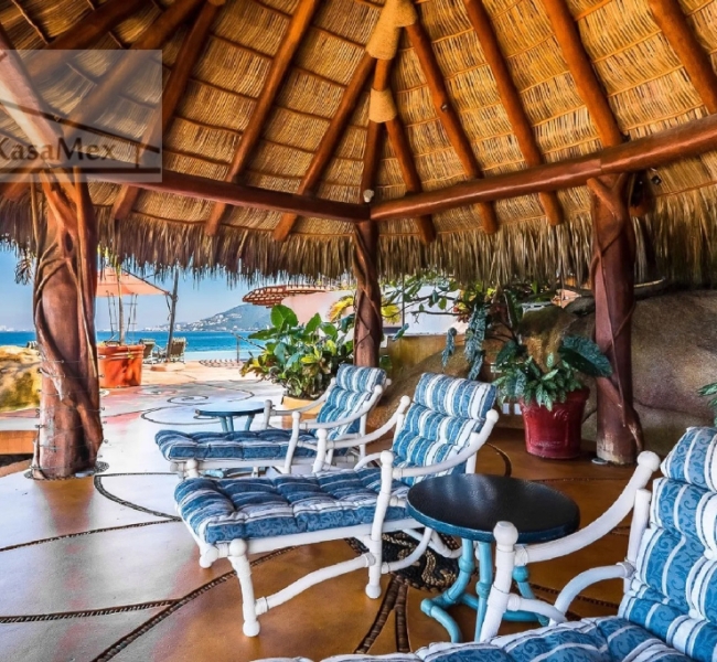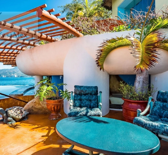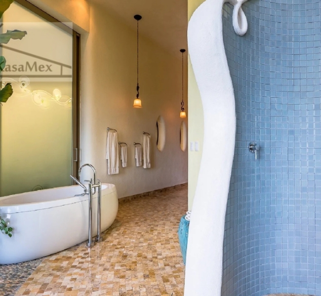 Situated on perhaps the most important site in the exclusive gated community in Puerto Vallarta. You are greeted by an imposing 2-story high solid wood entry door system. Upon entering the home your eyes are drawn to the expansive views of the Bay of Banderas and the entire coastline all the way to Punta Mita. The impressive and dramatic main living area is nearly 3 stories tall with a living tree meandering all the way through the roofline and the appearance of a palapa ceiling and roof. Custom-designed for entertaining, the living area opens to a full bar complete with its own natural rock formation embedded within and on the opposite side leads to the raised dining area. A culinary masterpiece, the design of the kitchen affords entertaining and preparation in an abundant space with the centerpiece being the boulder outcropping, bringing nature inside the living environment. While the overall breadth of the home is substantial, it is extremely liveable on only two floors and is fully serviced by an elevator. Living area 11,506 Sq Ft. Lot Site .3296 Acres As you walk through this turnkey home, note the artistic architectural details, from rounded walls, embedded hand-cut and placed river stones, exquisite marble, granite and stone surfaces, stained concrete flooring, and designs focused on taking advantage of the remarkable ocean vistas. Many of the bedrooms have dual purposes as is evidenced by their current use. For example the home is replete with a private home theater and executive office, both of which are easily converted to fully functioning bedrooms with their own private en-suite baths and walk-in closets with built-in cabinetry. The guest quarters is effectively a separate apartment and can be used by visiting guests who wish for additional privacy, or used as comfortable staff quarters with its own living room, kitchen area, private bedroom and full bath. In addition, the villa has a gym with private terrace, wine cellar for 100 bottles and a game/card room with private terrace overlooking the gardens. What would an oceanfront estate be without rambling terraces and patios to enjoy the lapping waves below? Thousands of feet of patio and terrace areas, off the bedrooms as well as off the main living areas of the home provide for an abundance of areas for relaxation and entertaining. The main terrace of the living room features a water trough feature with fountains, while the covered patio off the kitchen is ideal for dining at any time of the day. A heated Jacuzzi and pool offer the sun worshipers their own areas of captivation. Of course, the pool area also has a full bar and bathroom. And all of this engulfed by Mother Nature’s tropical paradise that surrounds Puerto Vallarta. There are simply too many features and amenities of this dramatic and artistic home to list out in such a small property profile. We invited you to set an appointment & discover for yourself this gorgeous property. The Price $ 3,950,000 USD. Price may vary without previous notice due to the exchange rate